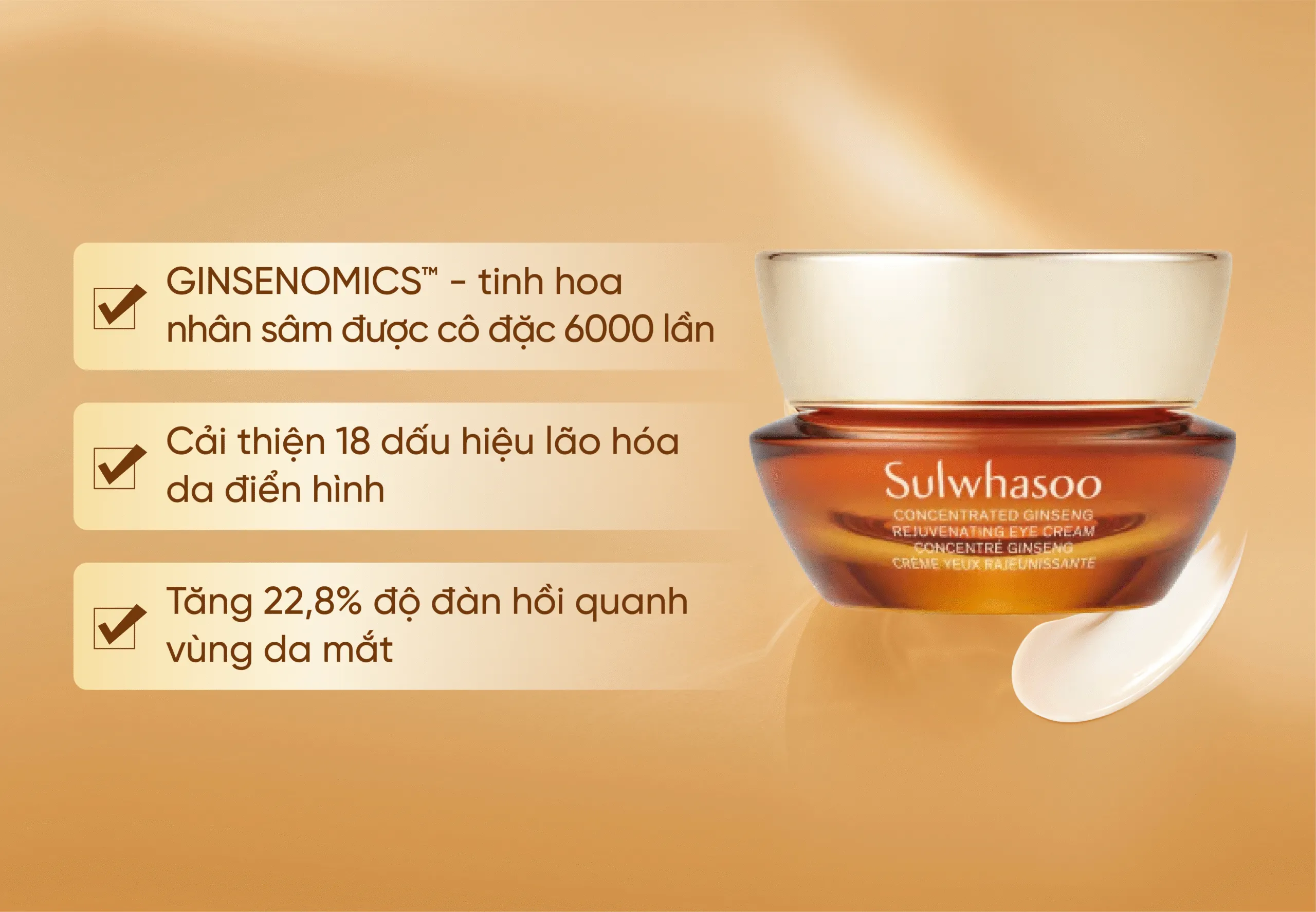 Nhân sâm từ lâu đã được biết đến như một “thần dược” trong y học cổ truyền, không chỉ giúp cải thiện sức khỏe mà còn có công dụng tái tạo và trẻ hóa làn da. Khi kết hợp với các hoạt chất chăm sóc da khác trong kem mắt Sulwhasoo, sản phẩm mang lại khả năng tăng cường mật độ da, làm đầy các vùng trũng và giảm thiểu dấu hiệu mệt mỏi. Ngoài ra, công thức còn giúp bảo vệ vùng da nhạy cảm khỏi các tác nhân gây hại từ môi trường, mang lại sự rạng rỡ và săn chắc lâu dài.