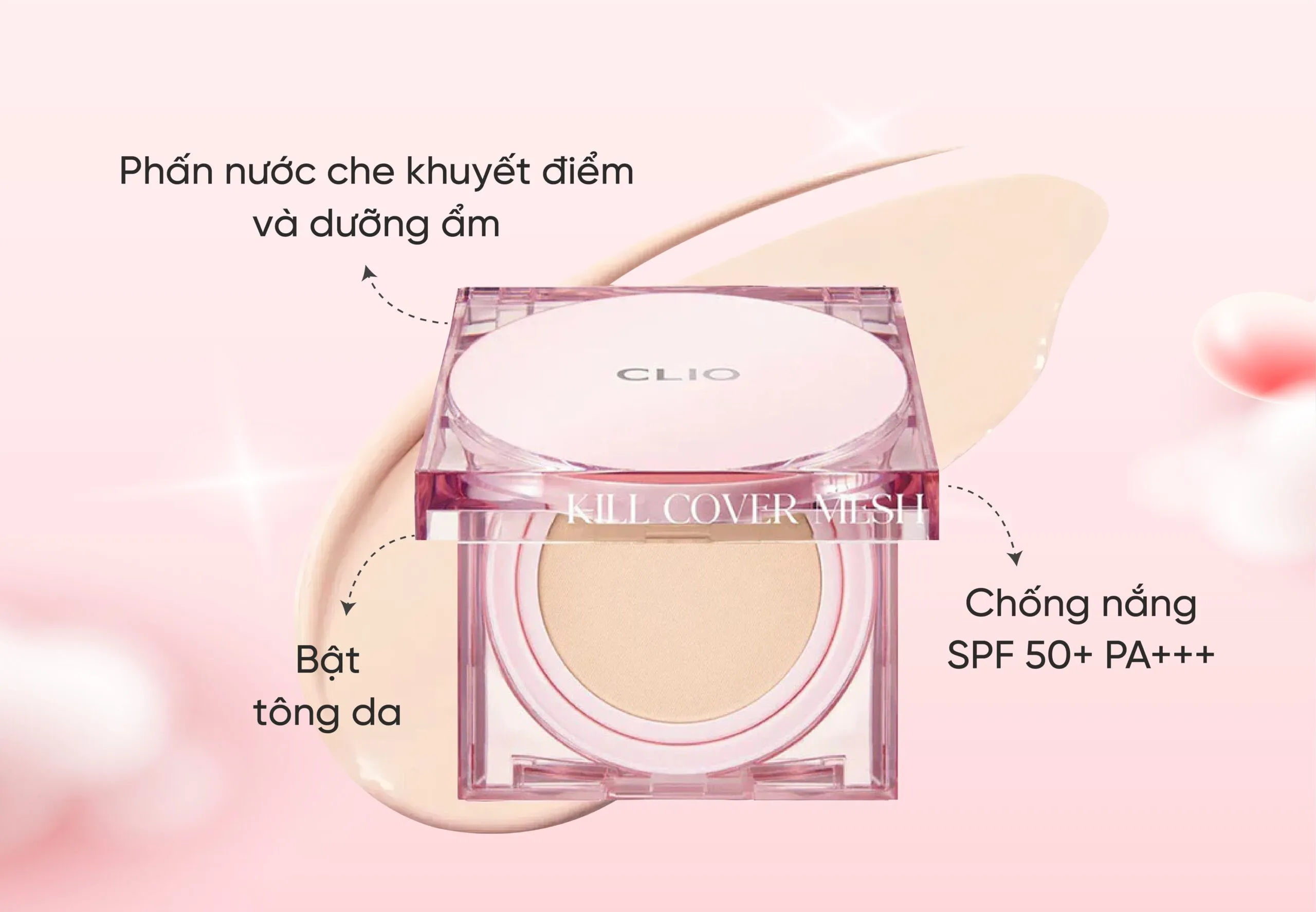 Không giống như nhiều loại cushion khác có độ che phủ cao nhưng lại dễ làm dày nền, Clio Kill Cover Mesh Glow sử dụng công nghệ che phủ linh hoạt, giúp làm mờ đốm nâu, tàn nhang, quầng thâm mắt, thâm mụn mà không bắt buộc dùng thêm kem che khuyết điểm. Lớp nền không chỉ đều màu mà còn giúp cải thiện kết cấu da, mang đến hiệu ứng da căng mịn, mượt mà, không bị cakey hay nặng mặt. Chỉ cần dặm nhẹ 1 – 2 lớp, làn da đã trở nên tươi sáng và rạng rỡ mà vẫn tự nhiên, nhẹ tênh.