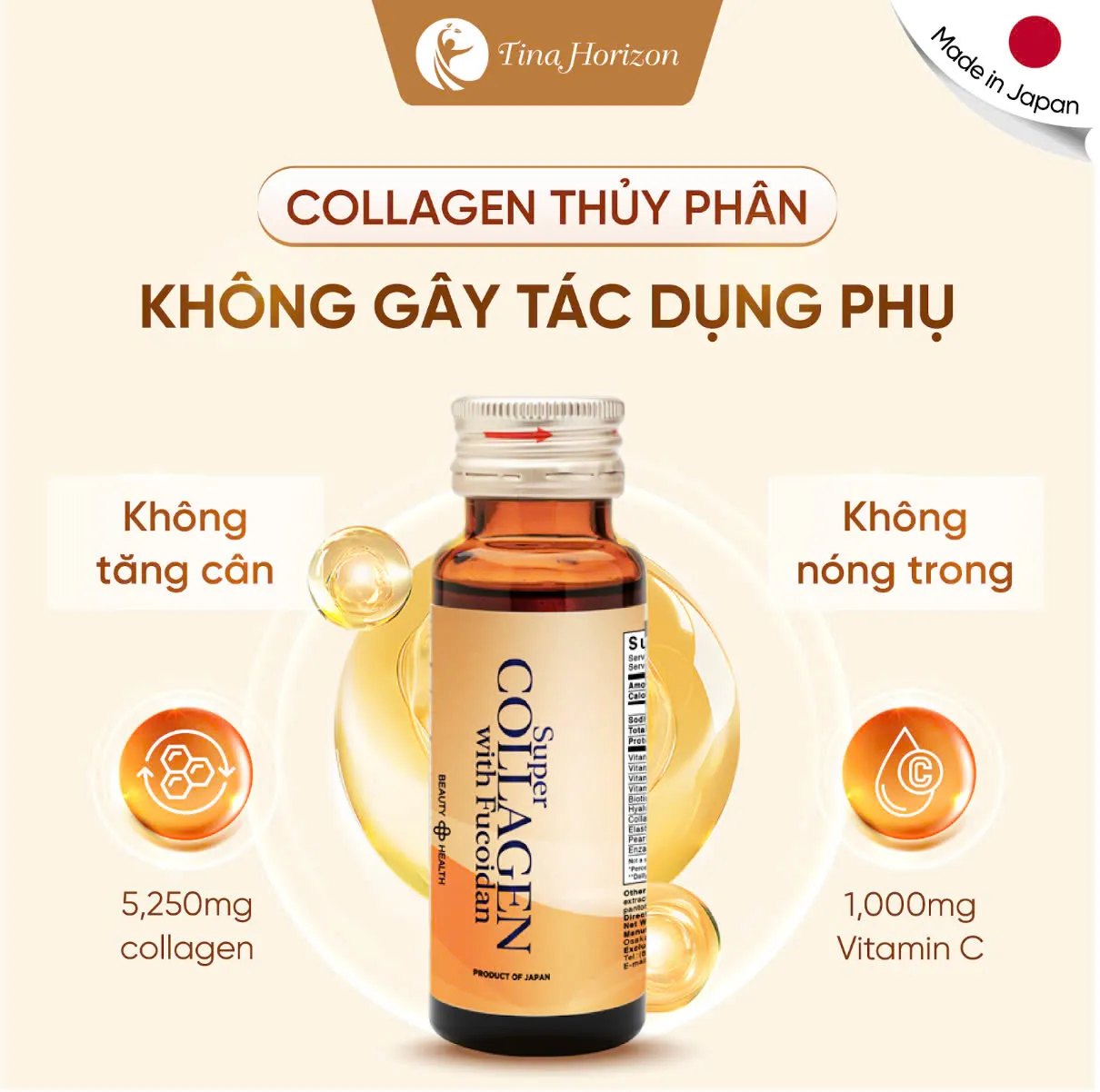 Tina Horizon giới thiệu Super Collagen with Fucoidan – sản phẩm collagen dạng nước cao cấp từ Nhật Bản, nổi bật với 5,250 mg collagen chiết xuất từ cá, kết hợp cùng 1,000 mg Vitamin C giúp tăng tổng hợp collagen tự nhiên. Nhờ cấu trúc gần giống collagen trong cơ thể, collagen thủy phân trong sản phẩm được hấp thụ nhanh chóng, cải thiện làn da và sức khỏe tổng thể hiệu quả.